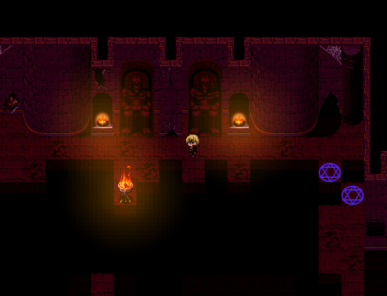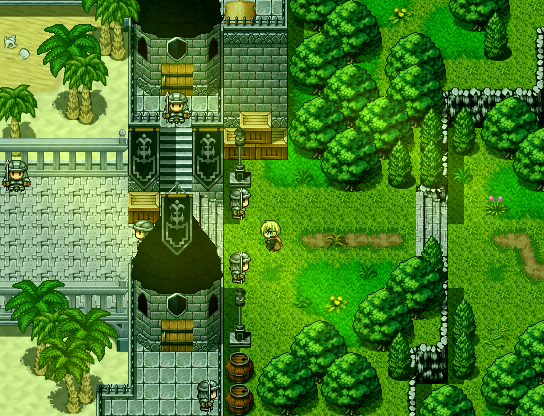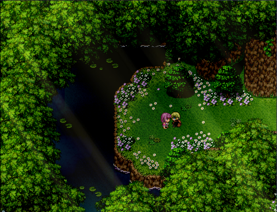 1) Pour ceux qui ne connaissent pas, VX est un logiciel rudimentaire, avec un seul set de graphismes pour l'ensemble du jeu (c'est le seul logiciel depuis 2000 à avoir cette restriction). Donc déjà, le fait de faire un joli jeu dans un style autre que rétro/carré avec des ressources variées tient de la gageure. Comme si ce n'était pas assez difficile, Garruk a décidé que des éléments au-dessus et des lumières ce serait mieux. On a donc un jeu avec des personnages chibi certes, mais dans un univers rond, coloré et plaisant à parcourir.