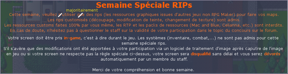 Communauté: Accueil | Forum | Chat | Commentaires | News | Flash-news | Screen de la semaine | Sorties | Tests | Gaming-Live | Interviews | Galerie | OST | Blogs | Recherche Apprendre: Visite guidée | RPG Maker 95 | RPG Maker 2003 | RPG Maker XP | RPG Maker VX | RPG Maker MV | Tutoriels | Guides | Making-of Télécharger: Programmes | Scripts/Plugins | Ressources graphiques / sonores | Packs de ressources | Midis | Eléments séparés | Sprites Jeux: Au hasard | Notre sélection | Sélection des membres | Tous les jeux | Jeux complets | Jouables en ligne | Le cimetière | RPG Maker 95 | RPG Maker 2000 | RPG Maker 2003 | RPG Maker XP | RPG Maker VX | RPG Maker VX Ace | RPG Maker MV | Autres | Proposer Ressources RPG Maker 2000/2003: Chipsets | Charsets | Panoramas | Backdrops | Facesets | Battle anims | Battle charsets | Monstres | Systems | Templates Ressources RPG Maker XP: Tilesets | Autotiles | Characters | Battlers | Window skins | Icônes | Transitions | Fogs | Templates Ressources RPG Maker VX: Tilesets | Charsets | Facesets | Systèmes Ressources RPG Maker MV: Tilesets | Characters | Faces | Systèmes | Title | Battlebacks | Animations | SV/Ennemis Archives: Palmarès | L'Annuaire | Livre d'or | Le Wiki | Divers