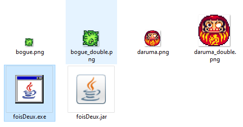 foisDeux crée un clone deux fois plus grand des images PNG du dossier. Utile pour convertir des graphismes 16*16 en graphismes 32*32 pour RPGMaker XP et VX.