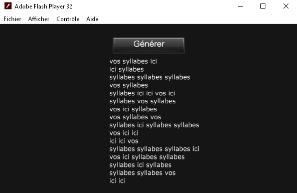 Pour le faire fonctionner, il suffit d'entrer vos syllabes ou groupes de mots dans le fichier xml (vous pouvez en utiliser plus de trois), et lancer le fichier swf avec Flash.