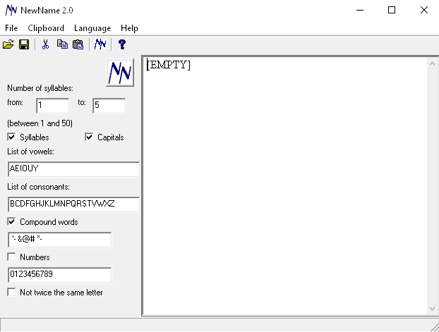 Un générateur de noms où vous entrez le nombre minimum et maximum de lettres, et vous obtenez une série de mots.