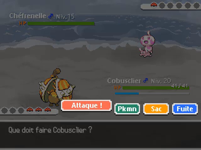 Voici un petit screenshot du mode de combat de mon jeu, ici un Cobusclier shiny contre Chefrenelle qui l'emportera ? lien du système de combat complet https://www.youtube.com/watch?v=1JwiHOu2Z8Y